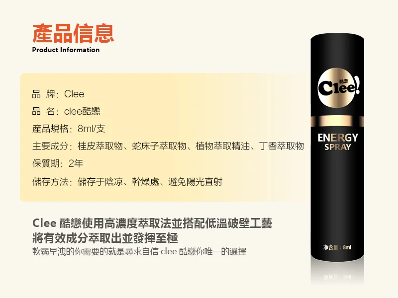 男士持久喷雾延时助勃成人用品 酷恋clee情趣用品延时助勃喷雾是外用持久液產品。酷恋男士持久喷雾,专为延时助勃设计。喷雾剂型使用便捷,帮助提升男性持久力与勃起硬度。适用于追求更长久亲密体验的成人情趣场景。 用戶評分5/5(13則評價),累計銷售41件。