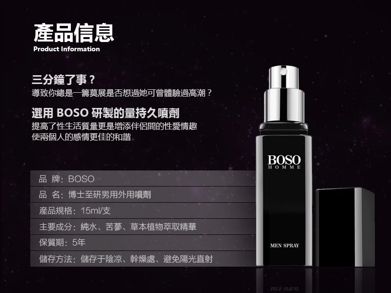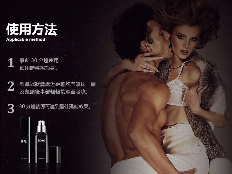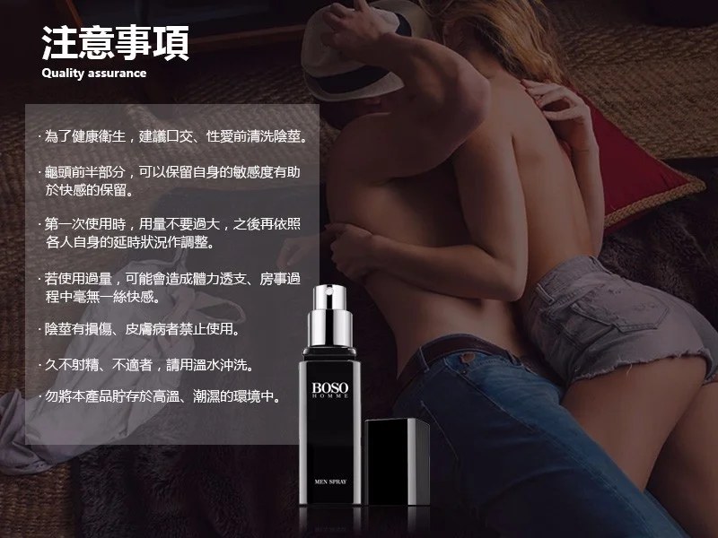 男士延時噴霧持久爆款必入 男用專用BOSO持久噴霧是持久液產品。BOSO男士延時噴霧專為持久設計,有效提升控制力。增強自信,優化親密體驗。適用於追求更滿意性生活的男士。