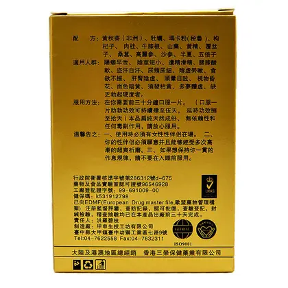 【主要成份】黄秋葵(非洲)、牡、玛卡粉(秘鲁)、枸杞子、肉桂、牛滕根、山蕖、黄精、覆盆子、桑葚、高丽参、沙参、半夏、五倍子等。【规格】10颗