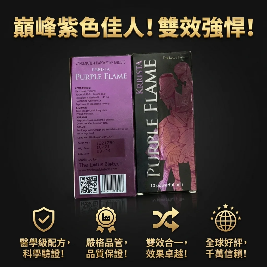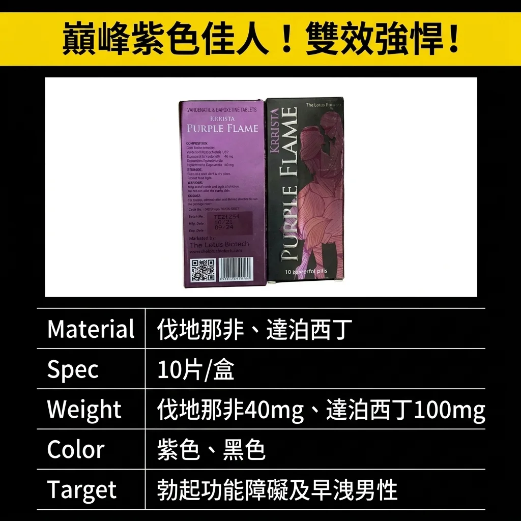 超级巅峰希爱力双效片 伐地那非40mg达泊西丁100mg 10粒盒装 紫色烈焰是男士壮阳藥產品。超级巅峰希爱力双效片,每粒含伐地那非40mg与达泊西丁100mg,强效协同作用。旨在提升男性表现力,提供双重支持。紫色烈焰盒装,每盒10粒。 規格特點:颜色: Purple。