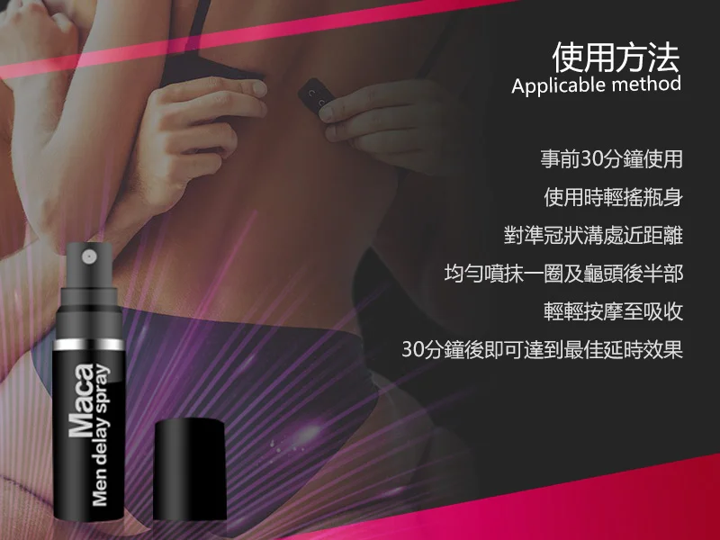使用前请先清洁并擦干皮肤,在亲密前15-30分钟,将喷雾均匀喷洒于敏感区域,轻轻按摩至吸收。建议初次使用从少量开始,根据个人感受调整用量。本产品采用MACA成分,能温和助勃延时,配合正确方法,可显著提升持久力,优化您的亲密体验。