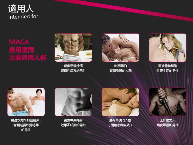 本产品专为成年男性设计,适用于希望提升持久力、优化亲密体验的用户。如有严重心血管疾病、皮肤破损或过敏史,建议咨询医生后使用。避免接触眼睛和黏膜,仅限外用。MACA成分温和助勃,助您安全增强自信,享受更持久的亲密时光。