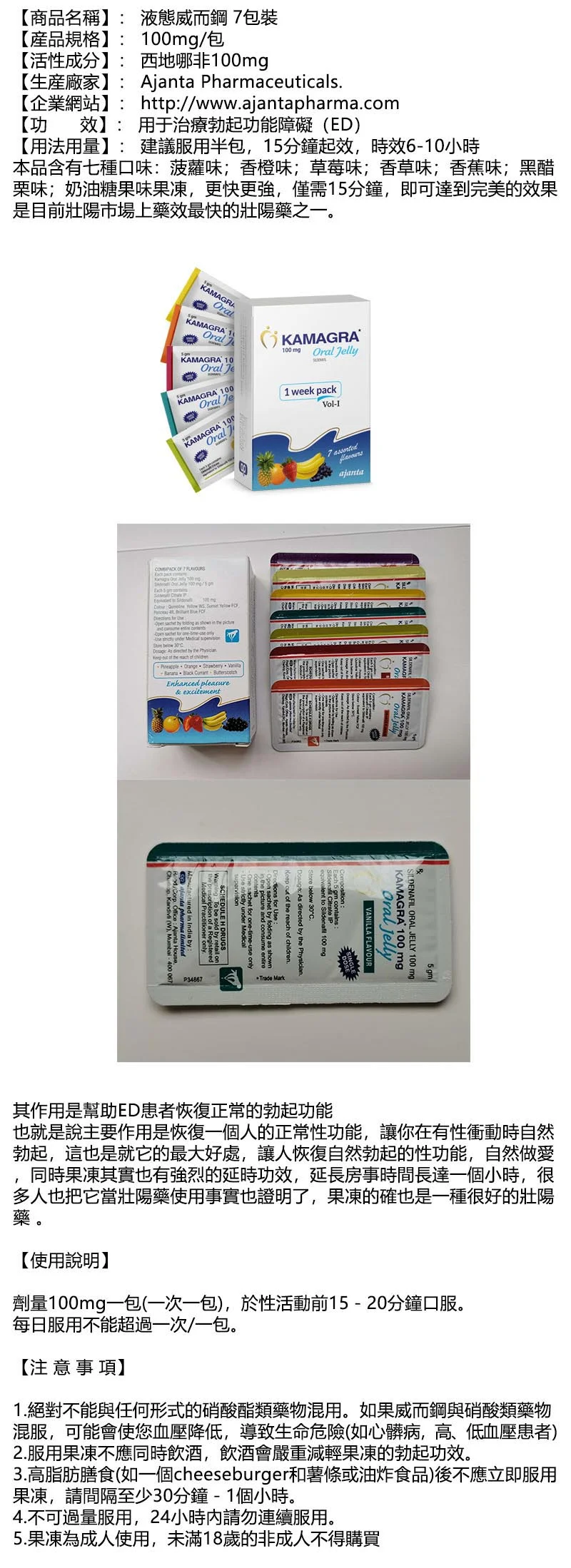 果凍威而鋼,Kamagra Oral Jelly,有時候也叫水果威而鋼、液態威而鋼,印度kamagra果凍威而鋼用於治療男性勃起功能障礙。印度kamagra果凍威而鋼是以凝膠形式製成的藥物,每盒Kamagra果凍威而鋼包含7袋不同口味的鳳梨,橙,草莓,香草,香蕉,黑醋栗和奶油。印度kamagra果凍放在特殊的果凍小袋中,在房事前服用。印度壯陽果凍適合年齡較大的男性,這些男性難以攝取片劑形式的藥物。